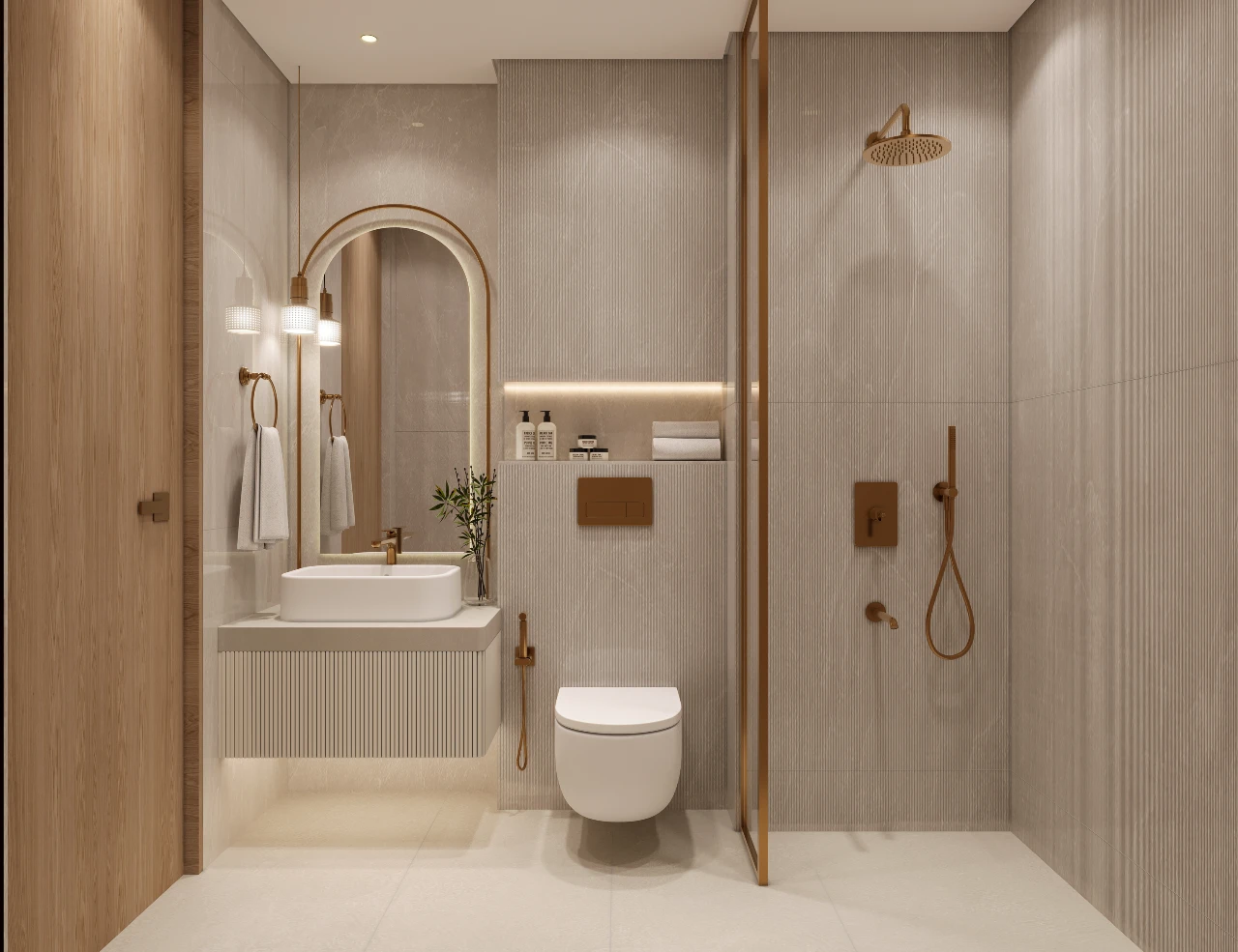 Opulent bathrooms showcasing premium Italian-wooden cabinetry.